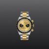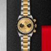 Coroa de rosca com a rosa TUDOR em relevo. Botões de rosca em ouro amarelo maciço posicionados às 2 e 4 horas. Aço revestido por uma camada de ouro amarelo de 0,3 mm