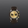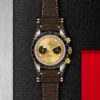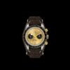 Coroa de rosca com a rosa TUDOR em relevo. Botões de rosca em ouro amarelo maciço posicionados às 2 e 4 horas. Aço revestido por uma camada de ouro amarelo de 0,3 mm