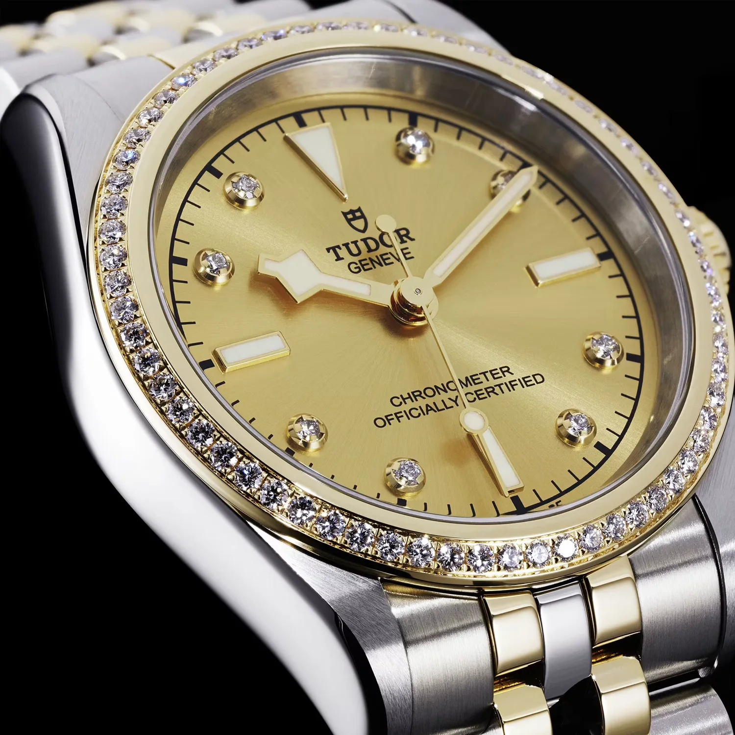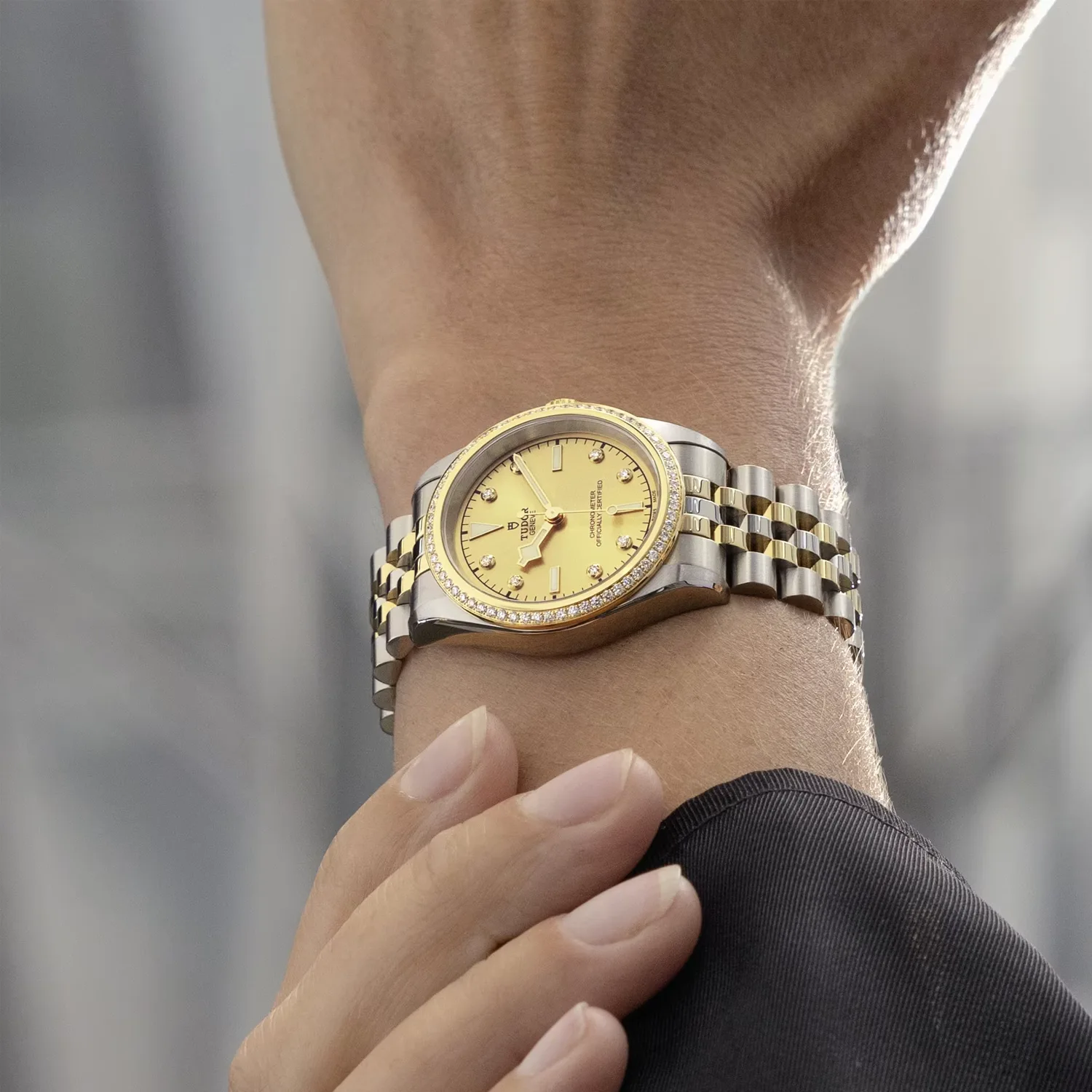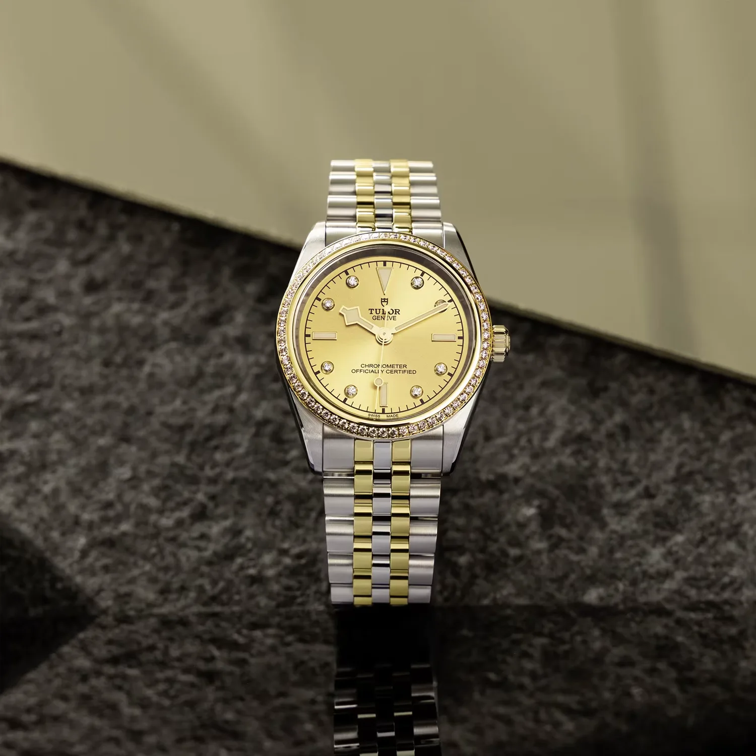 Primeiros elos centrais em aço ou ouro amarelo maciço. Os restantes elos centrais são feitos a partir de um núcleo de aço revestido com uma camada de ouro amarelo de 0,2 mm. Fecho desdobrável TUDOR “T-fit” com fecho de segurança. O logótipo presente no fecho é feito de ouro amarelo maciço