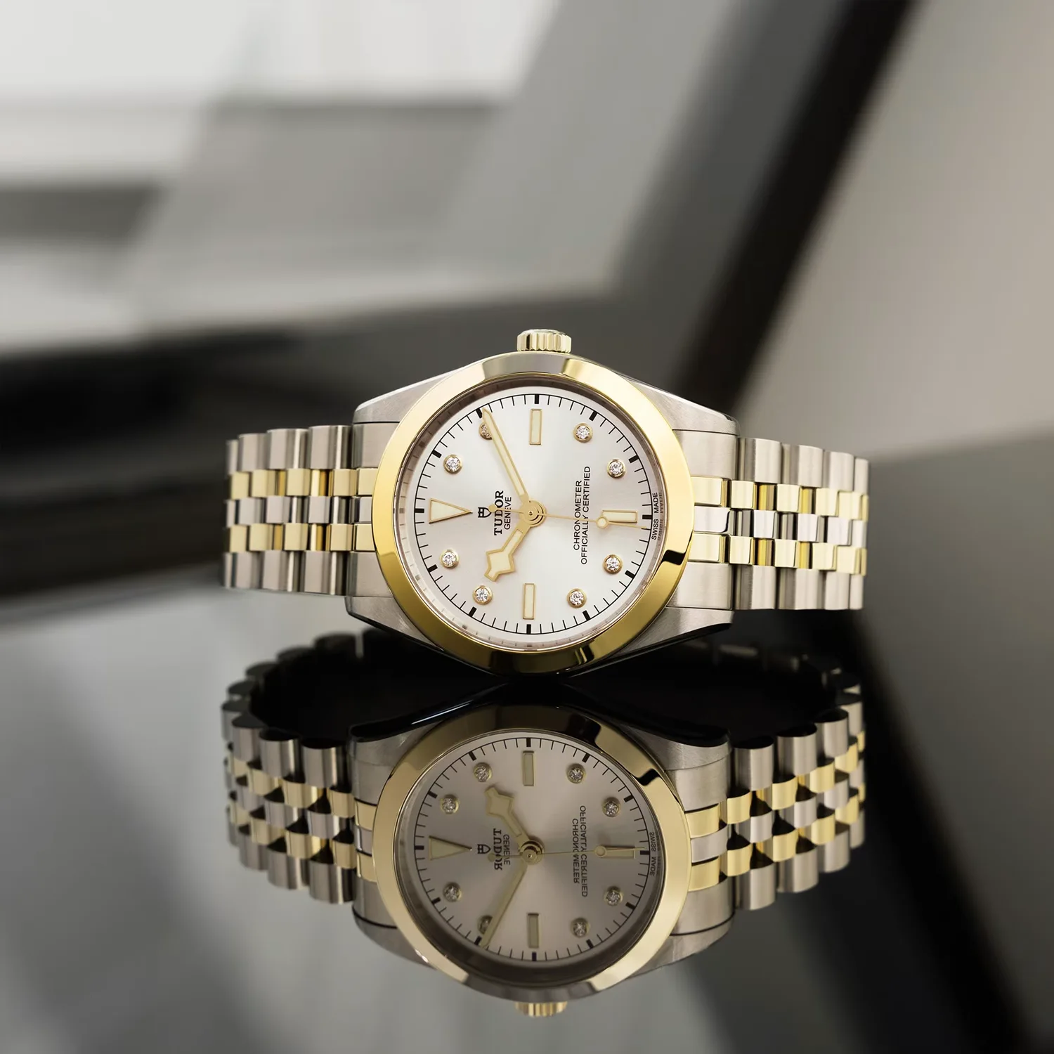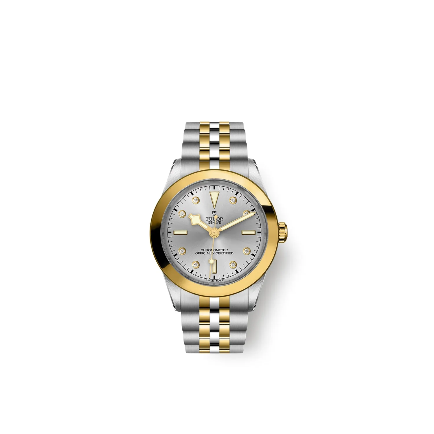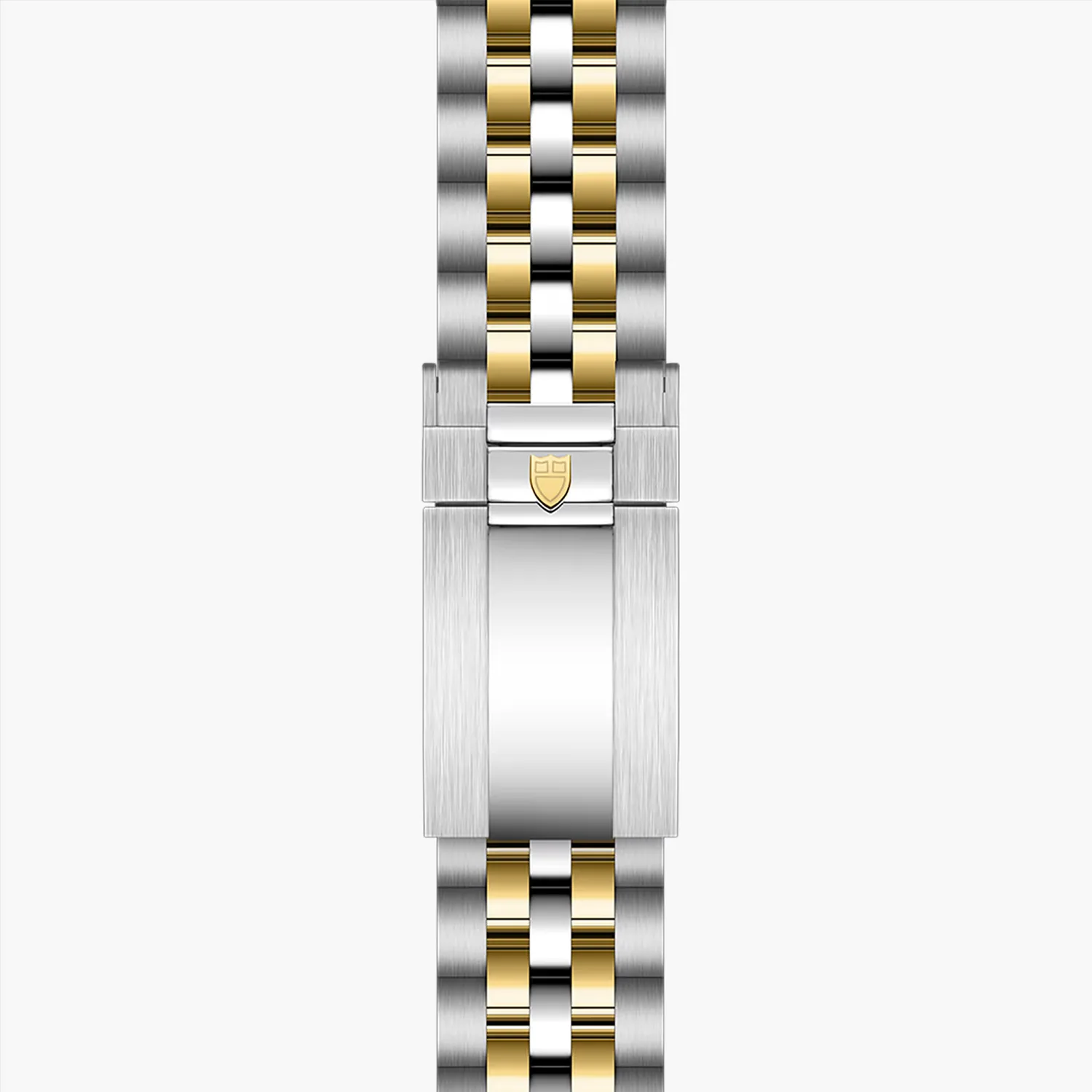 Primeiros elos centrais em aço ou ouro amarelo maciço. Os restantes elos centrais são feitos a partir de um núcleo de aço revestido com uma camada de ouro amarelo de 0,2 mm. Fecho desdobrável TUDOR “T-fit” com fecho de segurança. O logótipo presente no fecho é feito de ouro amarelo maciço