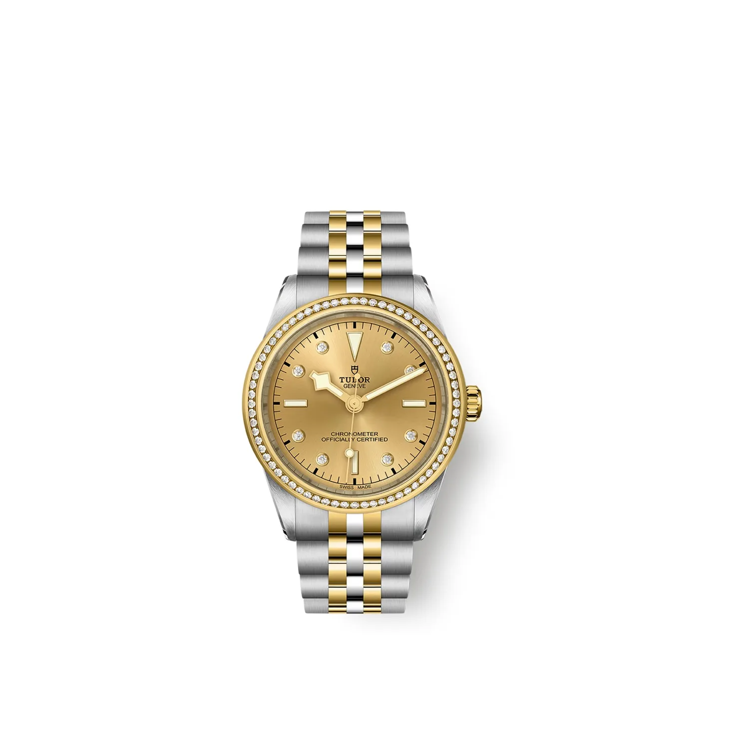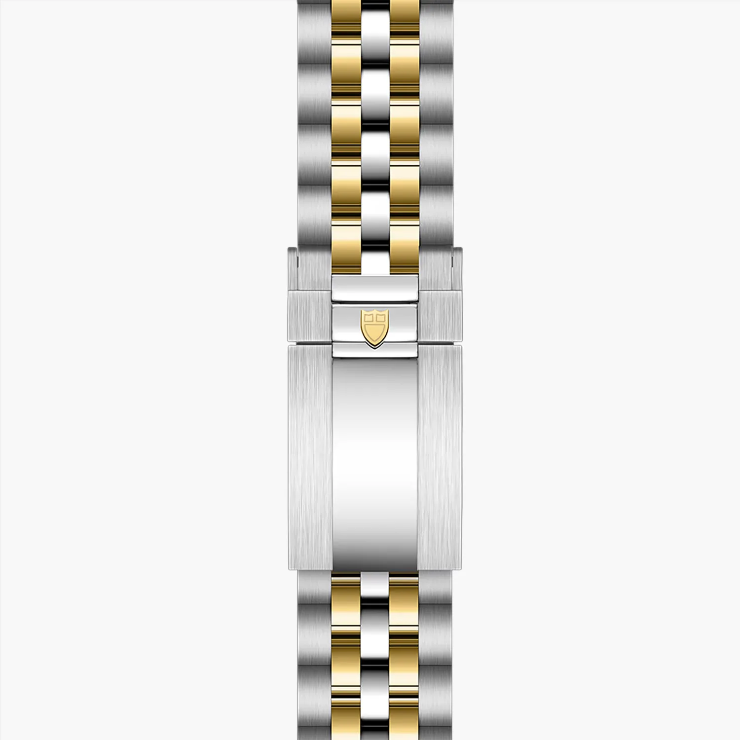 Primeiros elos centrais em aço ou ouro amarelo maciço. Os restantes elos centrais são feitos a partir de um núcleo de aço revestido com uma camada de ouro amarelo de 0,2 mm. Fecho desdobrável TUDOR “T-fit” com fecho de segurança. O logótipo presente no fecho é feito de ouro amarelo maciço