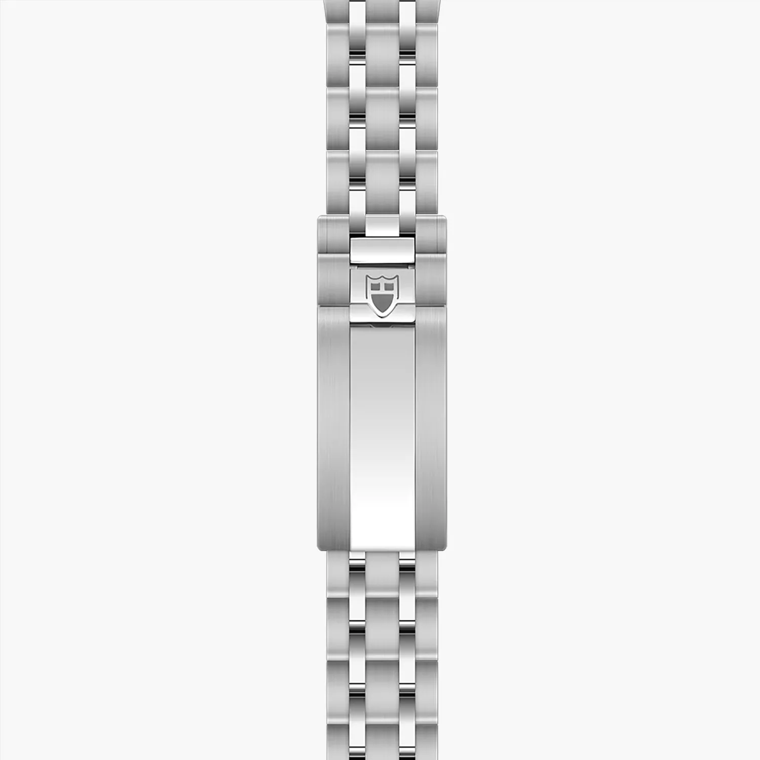 Bracelete incorporada de cinco elos em aço inoxidável, elos externos e centrais escovados e acetinados, elos intercalados polidos, com fecho desdobrável TUDOR “T-fit” e fecho de segurança