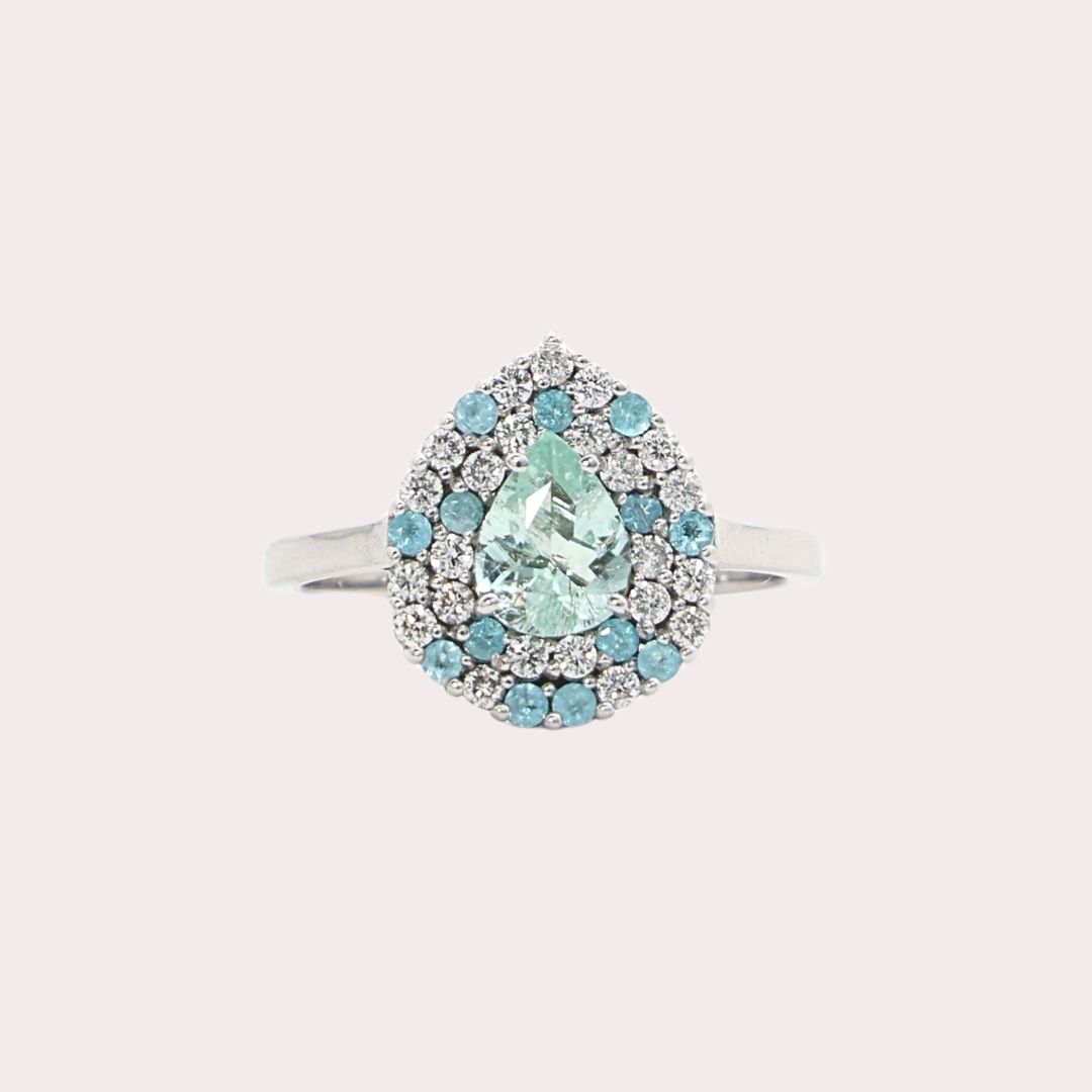 Anel em ouro branco 18K com 0,84ct em 14 turmalinas Paraíba e 0,35ct em 23 diamantes, exclusividade luminosa da Coleção Veneza.