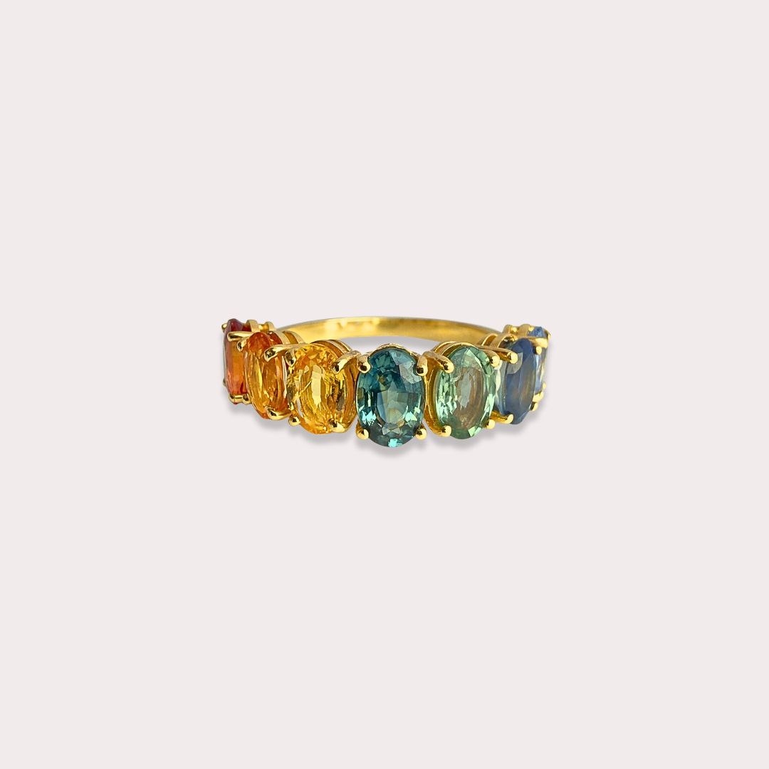 Anel meia aliança em ouro amarelo 18K com 3,24ct em 7 safiras coloridas, cor e leveza na Coleção Fluir.
