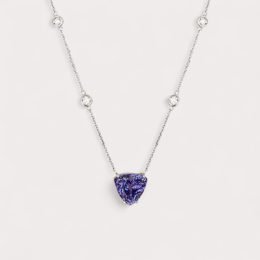 Colar em ouro branco 18K com 5,94ct em Tanzanita e 0,42ct em 6 diamantes, uma joia da Coleção Toscana que reflete o brilho sereno e sofisticado do entardecer italiano.