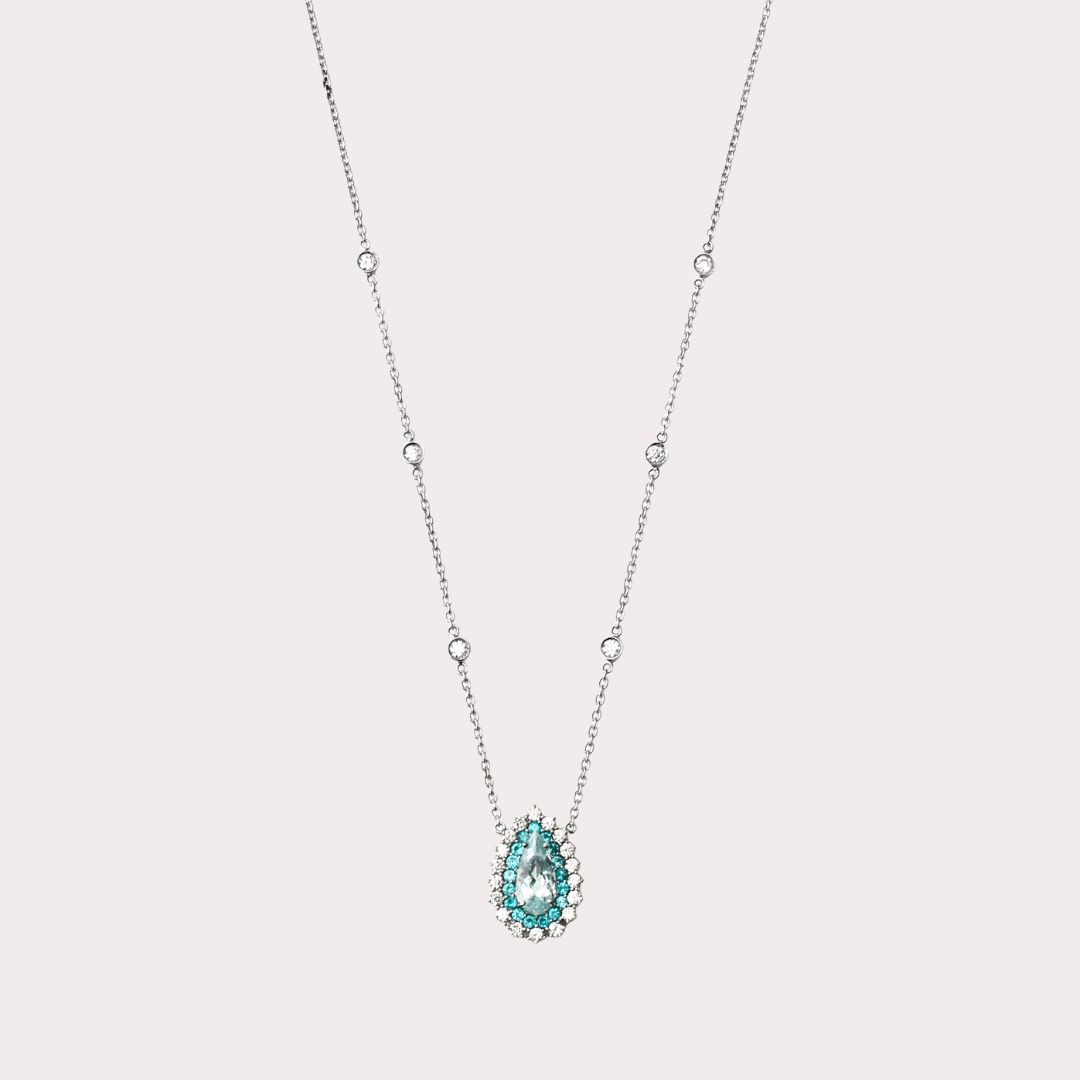 Colar em ouro branco 18K com 0,84ct em 18 Turmalinas Paraíba e 0,53ct em 24 diamantes, brilho raro e sofisticado da Coleção Veneza.