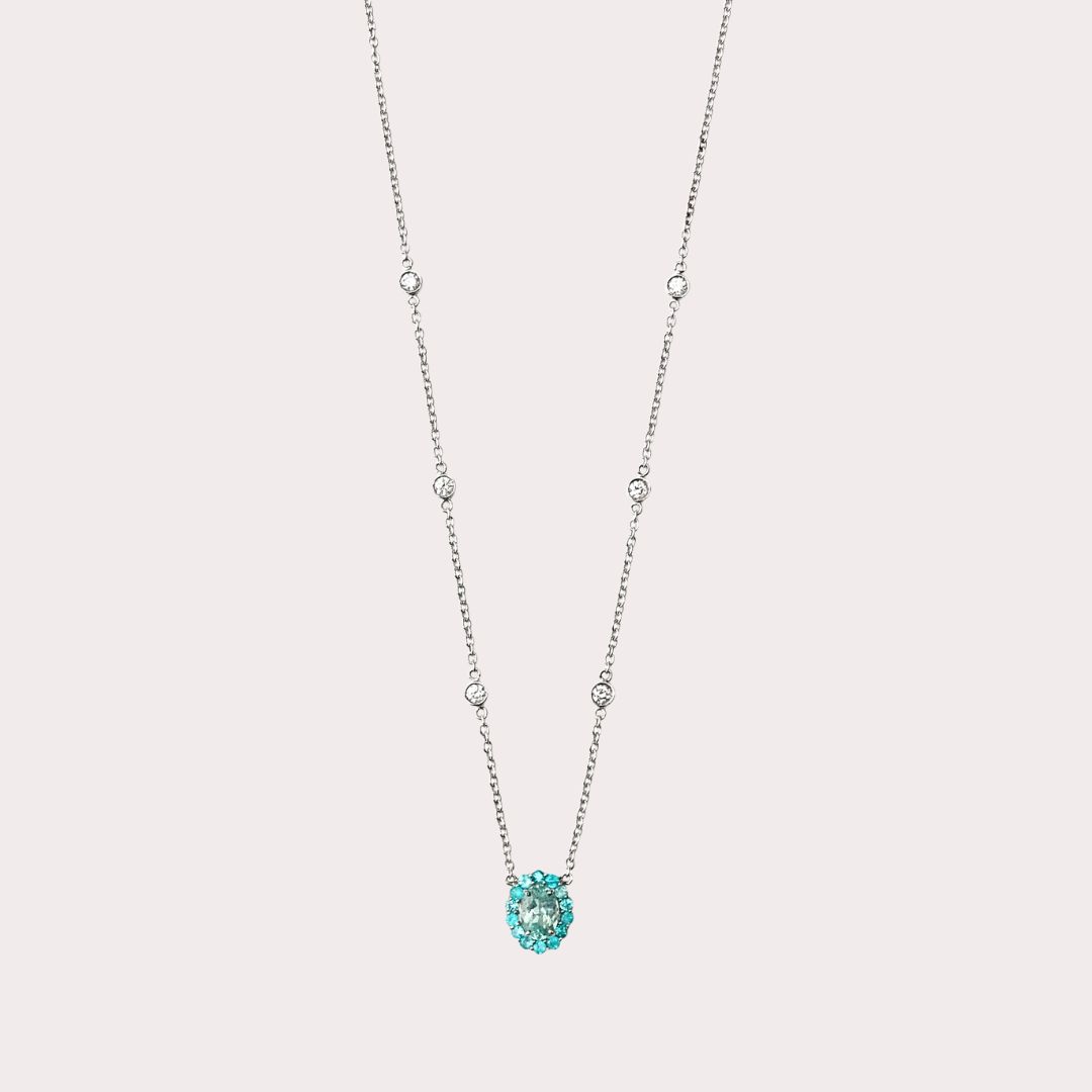 Colar em ouro branco 18K com 0,73ct em 18 Turmalinas Paraíba e 0,18ct em 6 diamantes, elegância luminosa da Coleção Veneza.