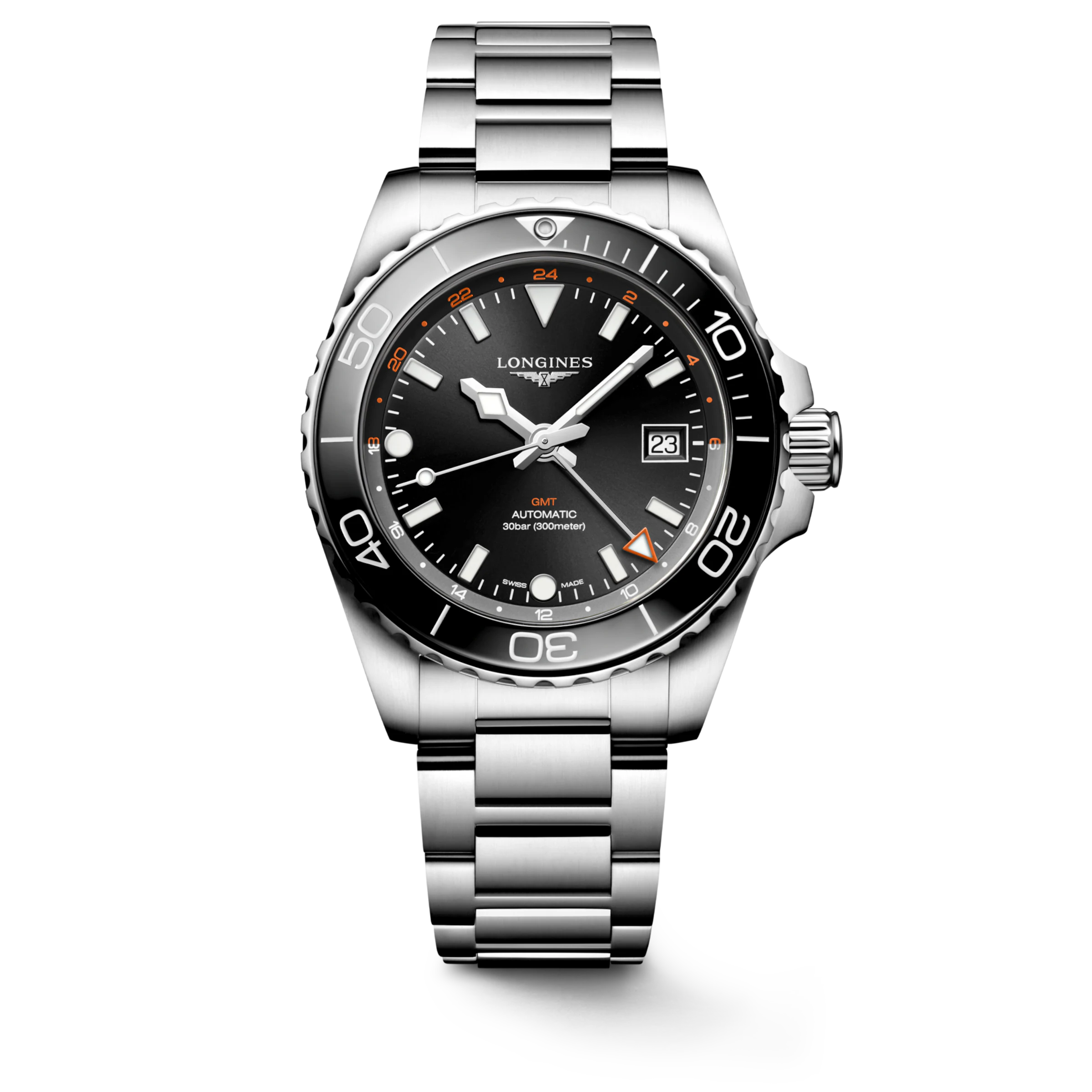 GMT data, movimento mecânico de corda automática que oscila a uma frequência de 25 200 alternâncias por hora, com uma reserva de marcha de aproximadamente 72 horas.